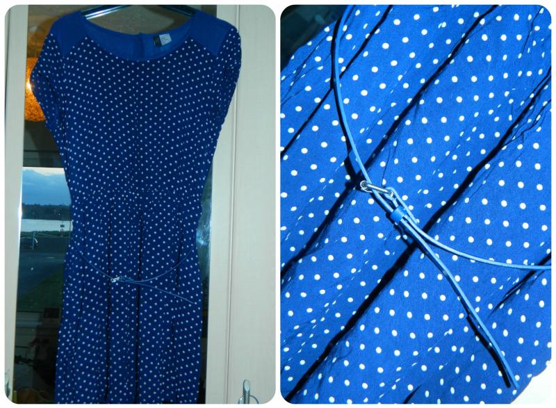 | H&M Blue Polka Dot Dress with Belt Size 12 Mesh top with button down back, two pockets & an elastic waist. Worn condition (no marks or damage) L 31 inches W 13 inches B 19 inches £7.50 |