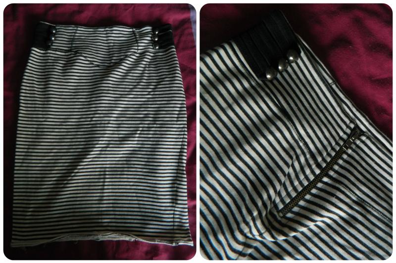 | River Island Monochrome High Waist Skirt Size 10 Exposed Zip, metal buttons on side and body con fit. Worn condition (no marks or damage) L 21 inches W 14 inches £6.50 |