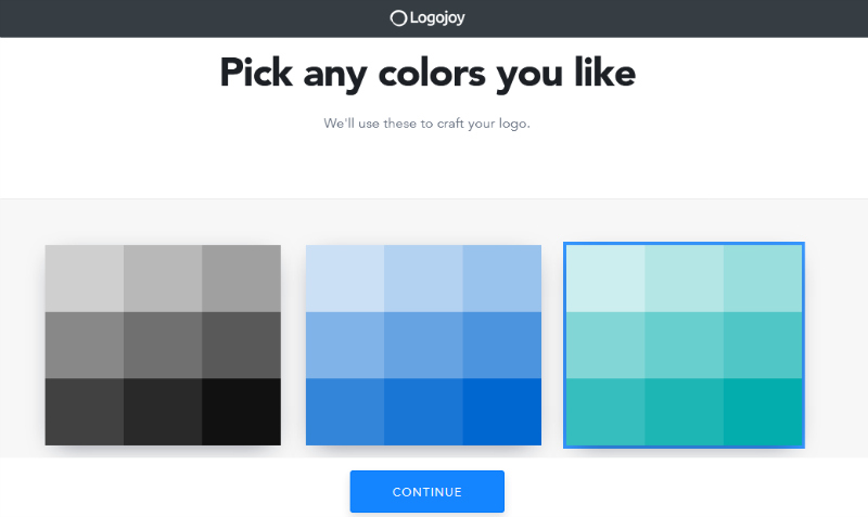 So the software knows the sort of thing you’re looking for you have to pick 5 of more previously created logos as a form of inspiration. I picked one with a font I liked, one with a colour scheme, one with the positioning and two more similar ones in hope that it would give a good idea of what I was looking for. Then you pick a colour scheme. I had no idea how this would work but continuing through you can see just how simply it all comes together.