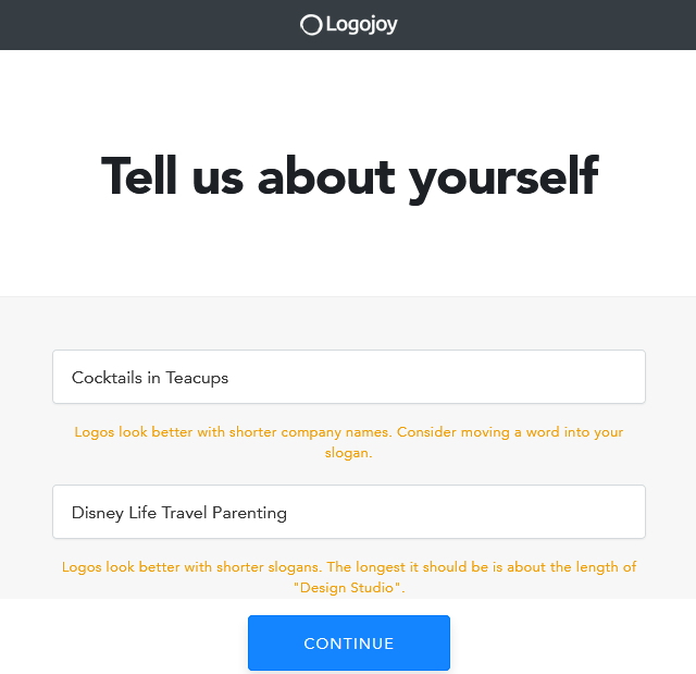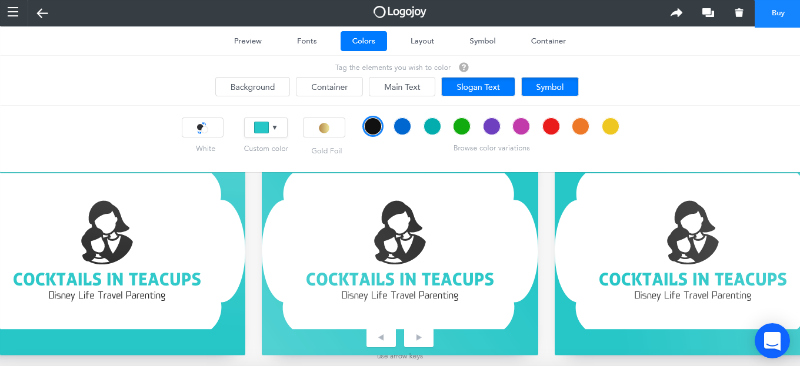 Next you enter what you want your caption or slogan to be, it suggests the shorter the better but I decided to go with what I use as a tag line for my blog, the four main principals write about, Disney, Life, Travel and Parenting. Having seen the finished logo I think it looks great under Cocktails in Teacups and really explains what I’m all about. Although it does suggest shortening, go with your gut and what you think is best.