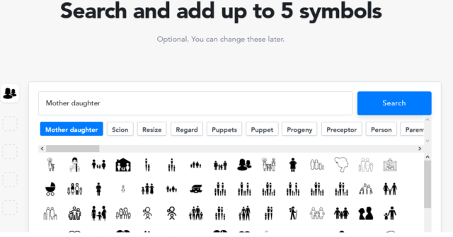 Next you have to pick 5 symbols that best represent your blog or your business. I first searched for families and disappointingly most of them had a mother and father so I searched for mother and daughter instead. I was happy to see loads of options so I selected one. Then I searched for a tea cup, followed by a cocktail, a passport and finally a suitcase. I felt all these icons represented my blog content and I loved the fact they were so simplistic they could mean a multitude of different things.